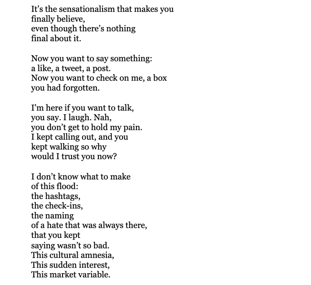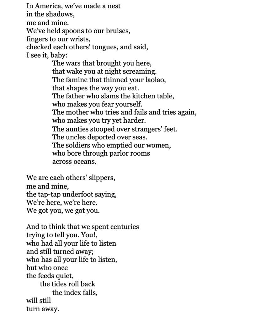Much thanks to Yindi Pei, Shannon Zhou, and Oanh Vu for reading and for feedback. Big love to Meriwether Clarke for her poet’s eye and her sensitivity. Thanks to Bao Phi for asking what it’d be like if I ended this poem on us, rather than on the reaction of others. Hopefully, that can be the next poem.