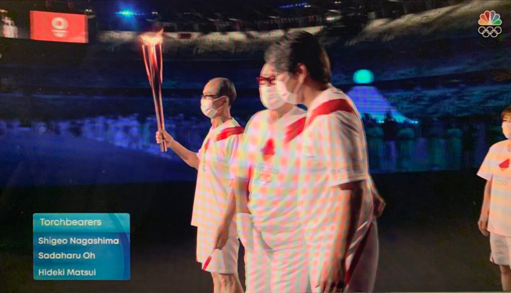 torch time! very moving to see Japanese baseball vet Shigeo Nagashima accompanied by two other Japanese baseball icons, carrying the torch. while i don’t follow baseball, i do know that it was popularized in Japan by American English teachers and missionaries, that baseball was a lifeline for a lot of Japanese Americans forced into American internment camps during WWII, and that it’s been used as a tool of US-Japanese diplomacy over the years: